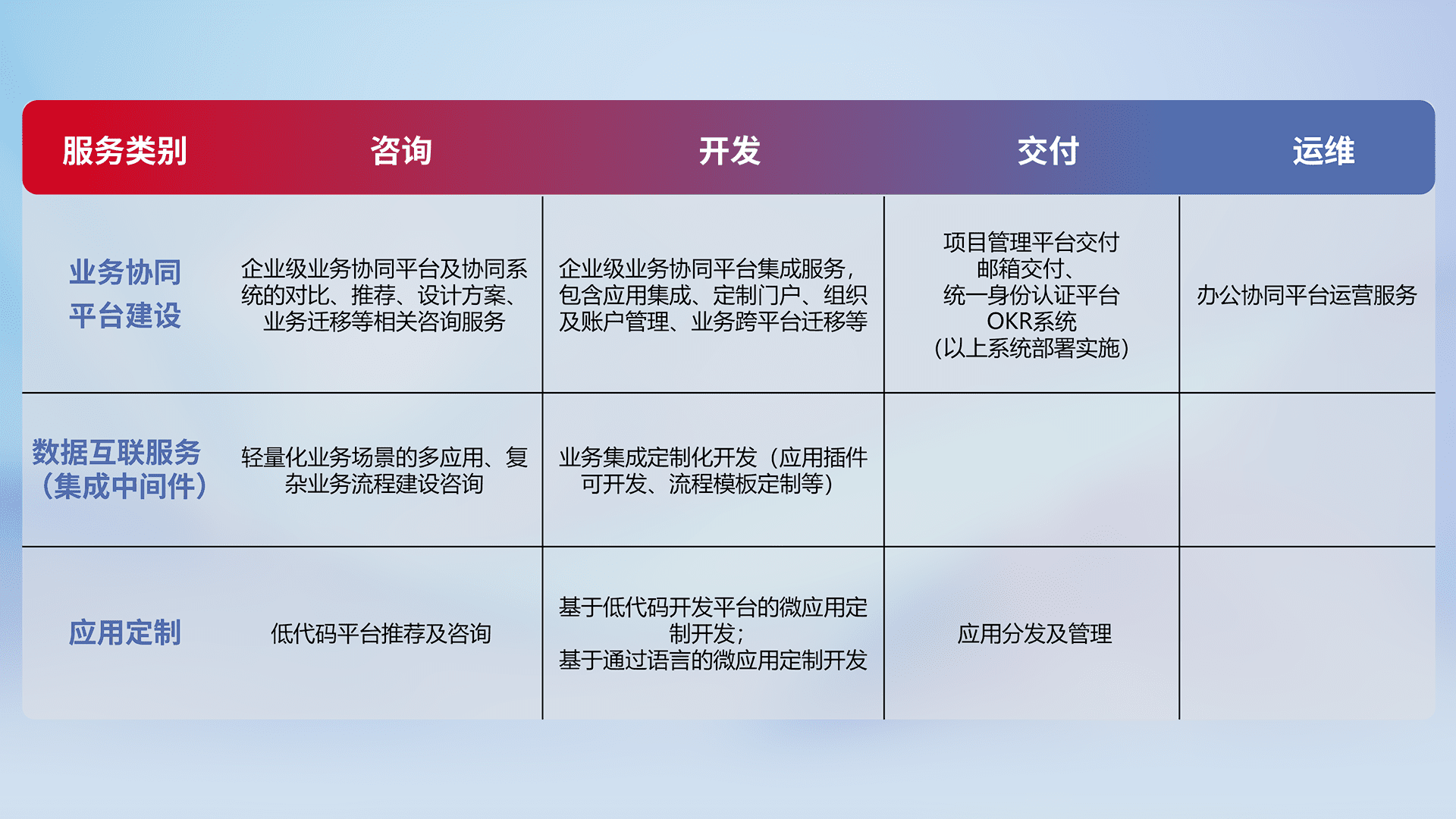 针对钉钉、、企微、、、IDaas等平台级产品提供产品的规划、、、方案、、、、交付、、定制化开发等服务,,,实现如统一协同办公、、智能客户服务、、混合会议管理、、智能数据查询、、、、等业务场景,,实现数字化转型。。
