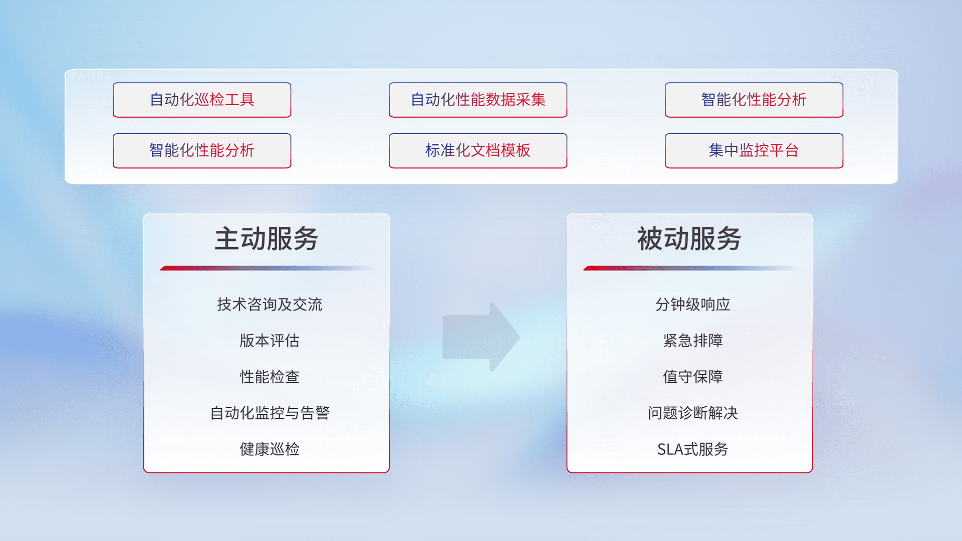 智能化工具和标准化文档,,保障服务质量,,提供主动服务(包含技术咨询、、、版本评估、、性能检查、、、、自动化监控与告警、、健康巡检)和被动服务包含(分钟级响应、、、、紧急排障、、、值守保障、、问题诊断解决、、、、SLA服务)。。。。