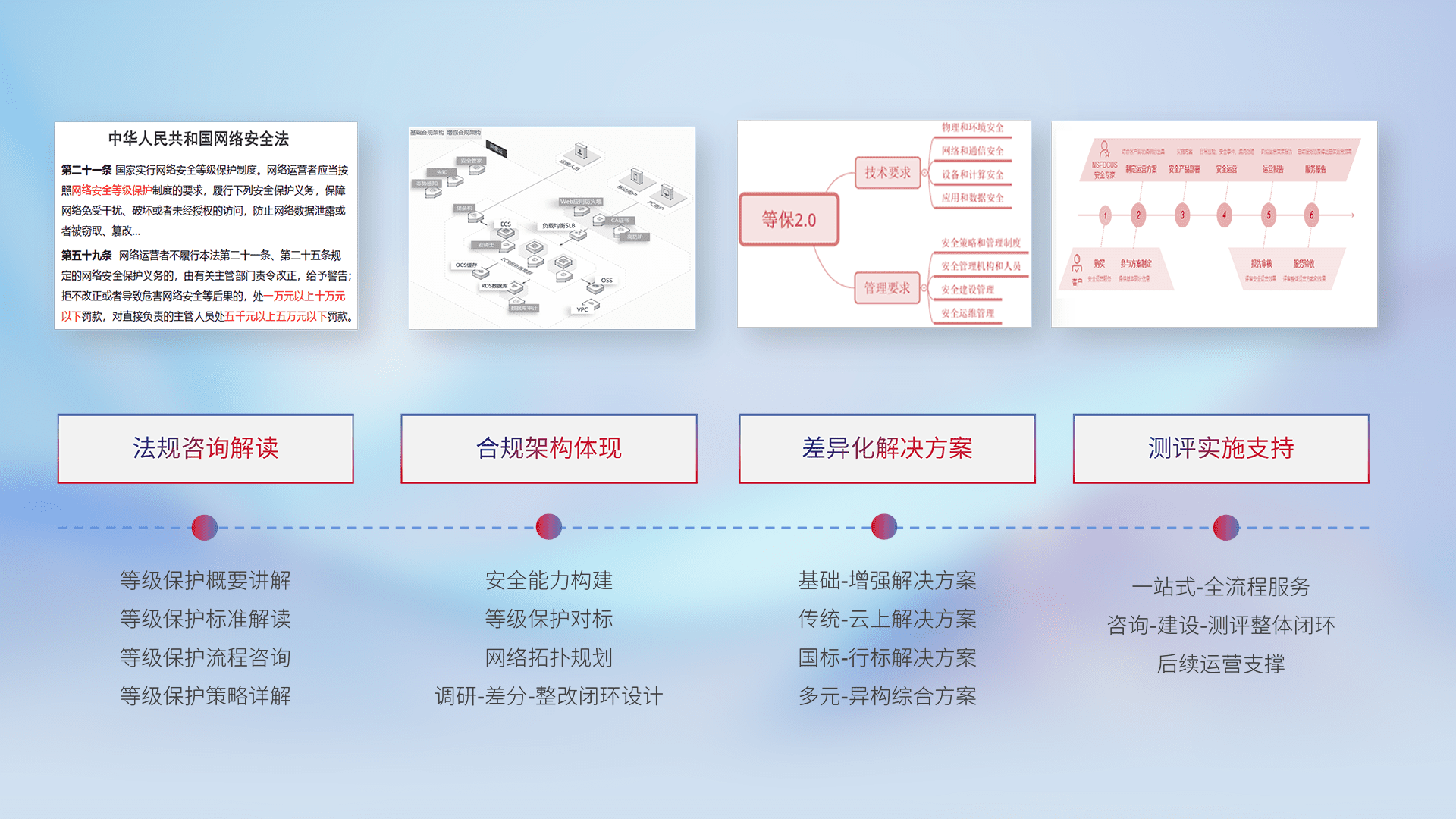 通过专业的法律咨询解读、、、、合规架构体现、、、差异化解决方案、、测试实施支持等服务,,,为客户量身打造等保合规体系。。。